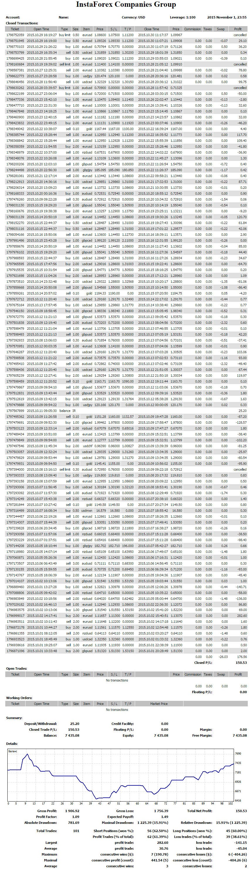 Trading on a long-term account has so far failed to bring me much profit. In the future I’m going to either give up long-term trades altogether or change my approach to market entry/exit points. In October 2015, my overall profit from trading on this account amounted to $75.