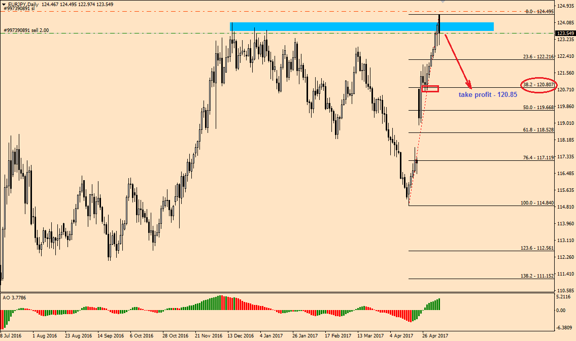 Позитивные новости из Европейского Союза и ожидания победы Эммануэля Макрона оказали значительное влияние на кросс EUR/JPY, который за три недели продемонстрировал практически безоткатный рост в 1000 пунктов. Но любой тренд рано или поздно заканчивается и эта валютная пара не станет исключением. Например сегодня, после незначительного северного ГЭП-а, уже появились первые признаки долгожданного снижения. Скорей всего, с завтрашнего дня последует еще одна медвежья волна. Поэтому я предлагаю запрыгнуть в лодку, постараться словить попутный ветер и на всех парусах прокатиться к южным берегам.