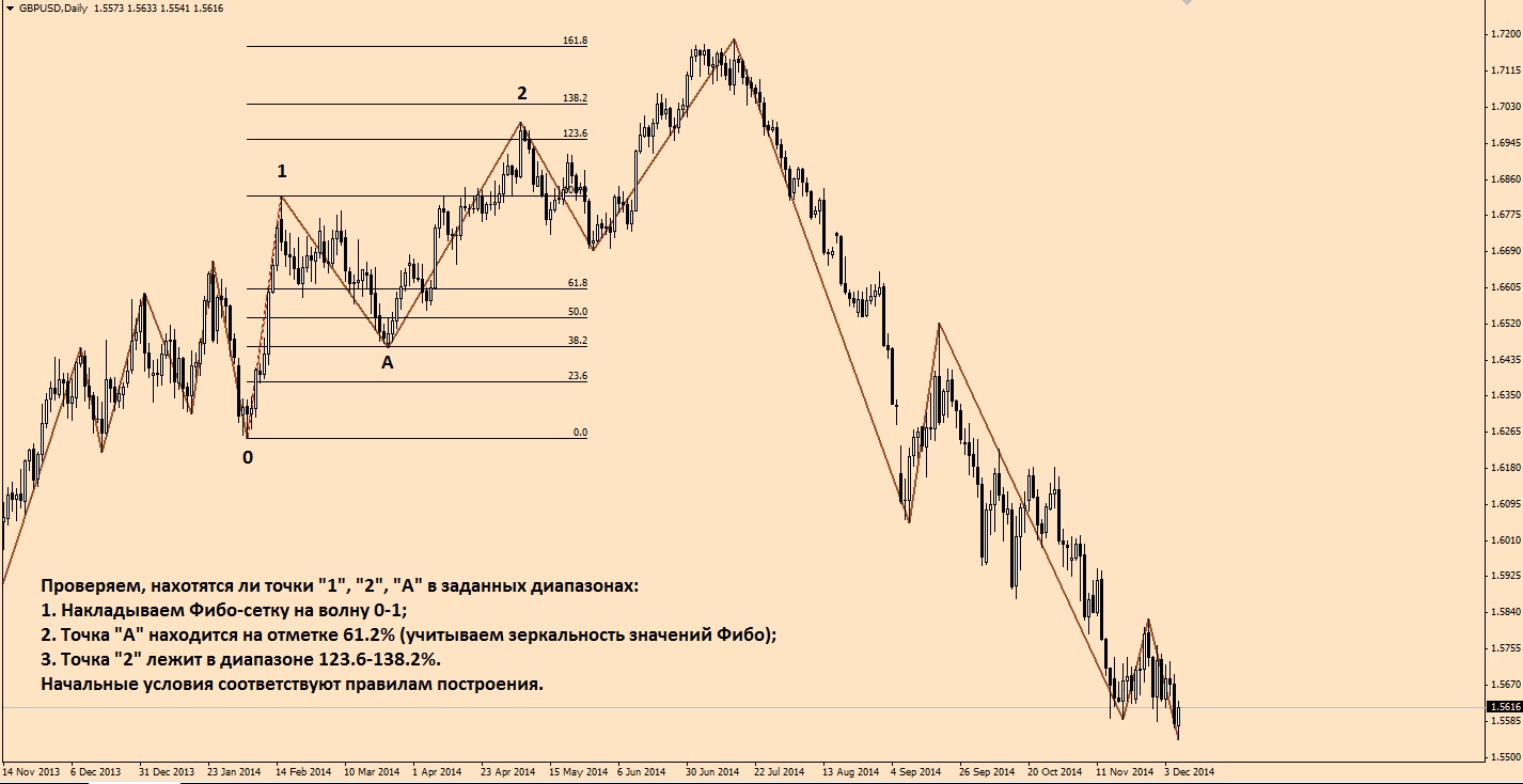 - если наложить Фибо-сетку на волну 0-1, то т."А" должна находится в диапазоне 61.8-78.6%, а т.2 - в диапазоне 123.6-161.8%;