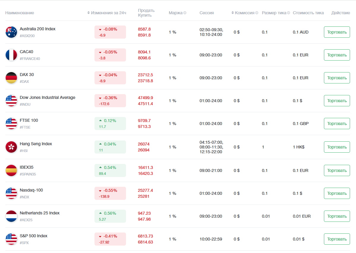 Как раз у брокера Инстафорекс доступна торговля многими наиболее популярными фондовыми индексами: S&P 500, NASDAQ 100, Dow Jones Industrial Avarage и т.д. Со всем перечнем индексов вы можете ознакомиться на этой странице.