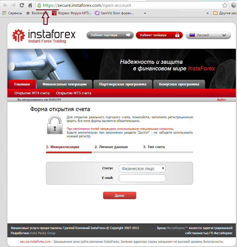 Создается счет в течении пары минут. Для этого необходимо перейти по ссылке и заполнить соответствующие поля. Уважаемые читатели, хочу обратить Ваше внимание на то, что все поля должны быть заполнены корректными данными. Указывайте свое Ф.И.О. и действующее место прописки, в противном случае Вам будет отказано в получении верификации. Также обращайте внимание на адресную строку в браузере. Она должна быть зеленого цвета и начинаться с https://