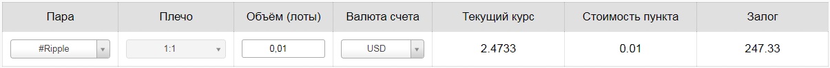 Ripple - открыть сделку минимальным объемом в 0.01 лота можно на депозите от 250$. Изменение курса на 1$ приведет к изменению эквити на 100$. Поэтому надо быть предельно осторожным при торговле этой монетой.