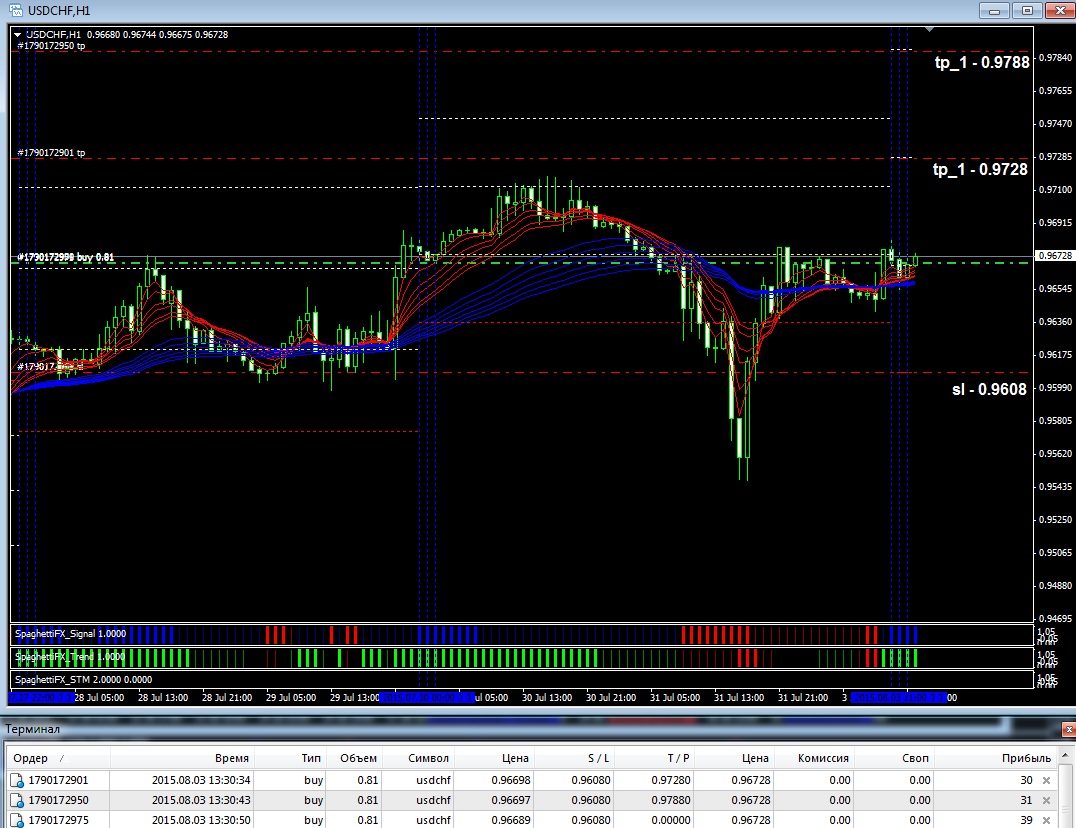 По USD/CHF на ТФ Н1 сформирован сигнал для открытия длинных позиций. На это указывают данные из опубликованной ранее ТС Spaghetti FX. Учитывая тот факт, что тренд на старших ТФ Н4 и D1 тоже восходящий, я открыл 3 покупки по 0.81 лота каждая с общим риском на серию сделок в 2%.